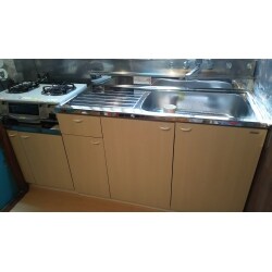 根本原因解決の為、配水管の高圧洗浄を行いました。流し台は当初シンクのみの交換予定でしたが、多少、経年劣化の部分もありましたので、コンロ台、吊収納、換気扇、照明とセットで、ご提案させて頂きました。床は下地張替えCFで仕上げました。