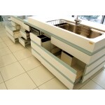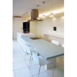 ダイニングとひとつながりになっているので、調理をする、食事をする、片づける、という一連の動作がスムーズになります。IHの部分からカウンターの高さを抑えているので、調理もしやすく、ダイニングテーブルも一般的な高さになり食事もしやすくなります。天板も扉も全て人工大理石でお作りしております。取っ手などがないので非常にすっきりと統一感があります。キッチン側にはシンク下の引き出しと、ごみ箱が分別して捨てられるシステム収納付き。IH下には引き出しと、同じ扉材でワゴンをお作りしました。反対側も全て引き出しになっているので、収納量もたっぷり。