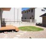 庭の草取りが面倒で改善したい。子供が庭遊びするので、柔らかい素材を希望。約60㎡ ・ウッドデッキの設置も検討 ・裏の影部分を砂利設置。約3㎡