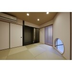 玄関からすぐの和室に丸窓を造作しました。 丸窓の和紙柄アクリルガラスから黒竹がほんのりと映り、旅館の玄関のような風情のある高級感が漂います。