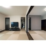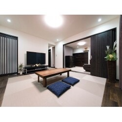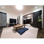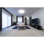 縁なし畳と無垢材ですっきりしたモダンな空間をご提案。 床暖房を敷設し、温度のバリアフリーも実現した空間です。