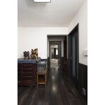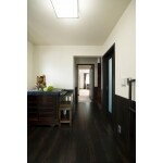 水まわりエリアの移動時に通る廊下に床暖房を敷設。リビングからの延長のようなデザインにし、視覚的な安心感と温度バリアフリーを実現。 玄関側はシックな落ち着きあるデザインを引き継ぎました。