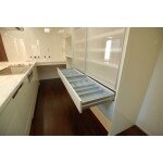 シンクの左手上部にはワンタッチで昇降する電動式の食器乾燥機を搭載しました。引き出しには、軽く押すだけで開閉ができるブルム社のタンデムボックスプラスブルモーションを採用。取っ手がないため見た目もすっきりします。IHの横に1口のガスコンロもビルトインしました。炒め物などでお鍋を振る事ができて便利です。天井まで全て収納式に。手の届きにくいキャビネットの上部にはダウンウォールを採用。上の段まで普段使いに収納が可能です。 デッドスペースになりがちなコーナー部分にはスライド式の引き出しを採用。奥まで無駄なく収納できます。電子レンジや炊飯器などの家電はオープン収納にし、蒸気排出ユニットを搭載しています。