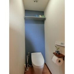 ショールームで実際の便器を見ていただいたところ、タンクレスの中でもコンパクトなサイズのLIXIL「サティスS」を気に入っていただけました。 使用水量は6リットル(マンションなので戸建てタイプより多い)と、以前の約半分の水量(メーカー発表値で)になりまた、タンクレスになったことで狭く窮屈だった扉と便器との間を広くとることができたので、圧迫感の無い快適なトイレ空間になりました。 また、海外勤務で購入された小物が置けるペーパーホルダー(お施主様支給)や、アクセントクロスとクロスと色調を合せた造作棚で、インテリアにもこだわったトイレルームにもなりました。