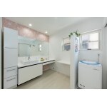 洗面台ではお化粧ができるようにデスクカウンターを設けました。 鏡は特注で壁面いっぱいの大きな鏡を取り付け、より広く見える効果も。
