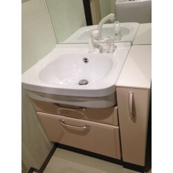 壁一面の鏡は気に入ってるから残して、下の洗面化粧台をたくさん収納があるタイプをご希望。明るいオレンジ系があると嬉しいわ。