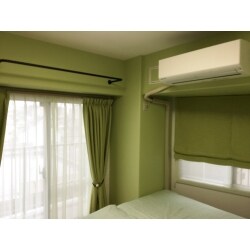 物干しバーのお悩みは、壁付けアイアン製の商品を設置。 奥様が大好きな「黄緑」をテーマに考えました。 床はナチュラル色を採用し、壁紙の『緑』を際立てる空間へと生まれ変わりました!