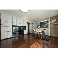 お忙しいご家族は出勤される時間や帰宅の時間もさまざまです。そんな中、家族がだんらんするLDKが、片付かないのが、奥様の一番のお悩みでした。 LDKの中で、一番ボリュームのある、テレビまわりの機器などの収納を第一に考えました。 出入りのほとんどなかったドアをふさいで壁とし、テレビボードを兼ねた壁面収納を提案しました。 あらかじめ、収納したい物のサイズを確認して、収納を割り付けました。 奥様ご希望のスタイリッシュなインテリアということで、壁面収納の扉は白を選択し、ダークな床とのコントラストをつけて、クールな印象に仕上げました。 キッチンや、お風呂などの水まわり設備は、お手入れ性や機能性、デザイン性を兼ね備えた最新のものを提案しました。調理や家事をより効率的に行っていただけます。