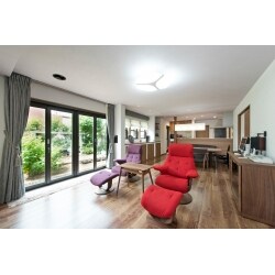 天井、壁、床の断熱施工と、サッシの交換で快適性をアップし、省エネにも貢献できるように提案しました。 耐震補強も施し、全体にバリアフリーとなり、ストレスのないお住まいになりました。 お住まいの使い勝手を考えて、間取り変更をして、動線を整理することをご提案しました。 南側の利用していない和室をつなげて、LDKとしました。開口部は、庭へつながるテラス窓を設けました。 通常の引き違いの窓にくらべ、開放感が格段にあがります。広々とした空間は、ご夫婦が、お互いの趣味などを満喫するのに十分です。 天井面にはスピーカーも設置して、ホームシアター風に利用することもできます。 キッチンには大きなパントリーを設けて、散らかりがちな物をすっきり収納します。洗濯のスペースもあり家事室としての機能ももたせています。 玄関土間スペースには、ワンちゃんのケージを入れるスペースを設けてあります。 階段ホール吹抜けの窓は、今後のメンテナンスを考えて、電動式を採用しました。
