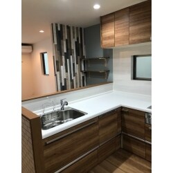 シンプルでスタイリッシュな木目調キッチンへ変更