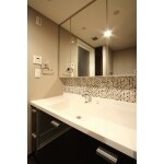 洗面化粧台のチャイルドミラー部分には水回り空間らしい透明感と宝石のようなガラスと大理石が入り混じるモザイクタイルをお張りしました。壁紙もモザイクタイルの色合いに合わせて張替えています。
