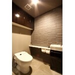 トイレの手洗い器上部には消臭効果も期待できるエコカラットプラスのグラナスルドラをお張りしました。凹凸の表情がダウンライトの光で陰影となり重厚感を感じます。床材はグラナスルドラとの相性を考慮し、クオーツサイト柄のフロアタイルを張り、雰囲気を向上させています。