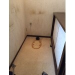 施工前の写真になります。手洗い器付近の壁には黒ずみの確認ができました。これはカビです。このままにしておくと、身体にも影響が出てしまうのでクロスの張り替えをおすすめいたします。