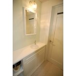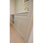 キャビネット手前は框組みの両開き戸、奥側は可動式の飾り棚となっております。飾り棚のキャビネットは、背面にグリーンのタイルを貼りました。巾木は鏡と同じモールディングを採用。手洗いの水栓には自動水栓を搭載。水栓に直接手を触れなくて良いので、お手入れが簡単です。天板にはホワイトの人工大理石を採用。フラットではなく段を作って丸みを出しました。人工大理石の加工も自社で行っております。鏡もキャビネットと同じ色の木枠で囲いました。背面の壁紙が鮮やかなグリーンなので、鏡を見た時に顔周りを華やかにしてくれます。