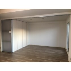 和室を解体し、天井は新規にボードを施工、クロス・フローリングの施工を行い、間仕切りには、半透明のアルミ吊戸を設置しました。押入れはハンドルレスの折戸を設置し、空間に馴染む仕上がりとなりました。