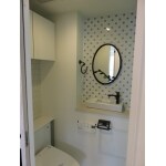 トイレ本体の背面に収納を設置し、手洗いを別で新設しました。また、手洗いカウンター上部にはガラスタイルとアイアンフレームのミラーでアクセントを付けています。