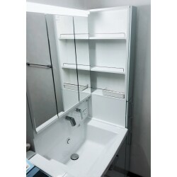 小物のごちゃごちゃがお悩みとのことでしたので、壁側にもキャビネットのある収納力のたっぷりの洗面台をご提案させていただきました。散らばりがちなものも、三面鏡の裏にスマートに収納することができます。 また、壁出し水栓は、洗面ボールに汚れがたまりにくく見た目もスッキリです。