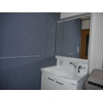 開きタイプ扉のキャビネットと3面鏡内に収納をたっぷり確保。広くて深い洗面ボウルで水はねが少なくなり、壁出し水栓の為根元に水がたまりにくくお手入れが簡単になったと思います。側面のアクセントクロスがおしゃれな空間を演出しています。
