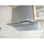 ・元々設置されていたレンジフードが本体奥側が下にせり出しているような形状でした。 ・その結果、取り外した際タイルが貼られていない部分が見えてきてしまい、その部分がどうなるのかお客様が気にされていた為、新設レンジフード本体と同色の鋼板で対応しました。