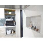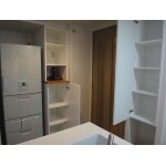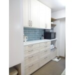 吊戸をなくした分、収納場所の確保が必要となりました。キッチンと同じシリーズのカップボードの横には隙間にピッたりと収まる収納を造作し収納力をアップしています。