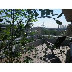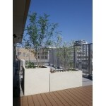 バルコニーにでたときの周りの視線を優しく遮るように鉢植えで植栽をして緑に囲まれたテラスをご提案しました。