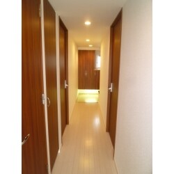 ブラウン調の建具が引き立つ、段差のないバリアフリー廊下に。