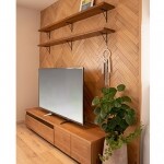 家族がくつろぐための、明るく広々としたリビング。テレビボードの壁には、H様こだわりのヘリンボーンを使用。1枚1枚違う表情で、リビングにあたたかみのある重厚感を与えます。主役のヘリンボーンに合うように、木目調の家具で統一。ほっと落ち着ける、上質なリビングになりました。