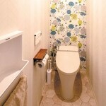 奥様が感じる「可愛い」がふんだんに詰め込まれた、大人可愛いトイレ。壁紙はホワイトをベースに、フラワー柄のアクセントクロスで華やかさをプラス。まるで海外の部屋のような雰囲気で、居心地が良くなりました。クッションフロアの床は、水や汚れに強く、お掃除も簡単。