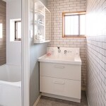 化粧洗面台は、リクシルのピアラで収納力と使い勝手が向上。収まりきらなかった日用品も、すっぽり収納できました。 キッチンのサブウェイタイルに合わせた、ホワイトのアクセントクロスとブルーグレーの壁紙が調和しています。