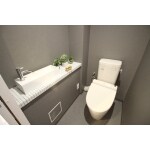 グレー&タイル張りの手洗いカウンターでスタイリッシュな空間に。 バスルームとテイストを揃えています。 ※トイレ本体は既存のものを使用し、内装のみのリフォームです
