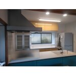 壁を取り払い、フラットな対面のキッチンに。キッチンの中も明るくとても広く感じられます。 キッチン本体と、カップボード&キッチンボードの色の組み合わせは、K様らしい斬新な組み合わせで、明るく爽やかなキッチンを演出しています。