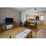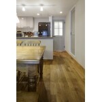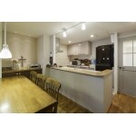 (旧東京ガスリモデリング株式会社での事例です。)キッチンまわりの壁はなくし、開放感と一体感を高めたLDK。また、ダイニングの床は肌触りのよいヨーロピアンオークの無垢仕上げにしました。遮音等級LL45のケナフマットと合板、無垢フローリングの3層構造にすることで、遮音性にも配慮しました。 リビングの扉、洗面所の扉などすべて取替えました。カントリー調のデザインとニュアンスのあるカラーを併せ持つ扉が、より一層手作り感とあたたかみを醸し出しています。