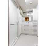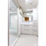 浴室はデッドースペースを使って1316sサイズに広がり、洗面所もPS横の壁面収納を撤去して壁を薄くし、1150サイズ幅の化粧台を設置しました。ボールとカウンター部分を短くし、天井までのトールキャビネットを設置して収納を大幅に増量しています。