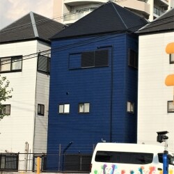 『人と違った色で』とご主人。現状のサッシがブラック色でしたので、淡色系統の色より、濃い目の色のほうが合うことをお話しさせていただきました。結果、ご主人の好みで濃い目のブルーを選定。全体的にぐっと引き締まったり個性的な外観に生まれ変わりました!