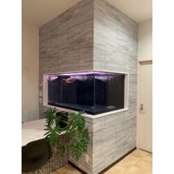 水槽の設置をするにあたり、壁に埋め込みができるスペースがあった為、壁の中に埋め込みをさせていただきました。 埋め込みにし内部には換気扇を設置。 独特の臭いももれることなく社内も快適です。 水槽は重さがある為、土間打ちをし床の補強もバッチリです。