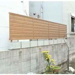 LIXILの横ルーバーの木目調フェンスで、色も綺麗なチェリーウッドを選ばれました。天然木のような風合いのアルミ形材パネルで表裏に曲線を施し、目隠しと通風を両立させたデザインです。 既存塀にケミカルアンカー打設し一段ブロックを積みフェンスを設置させていただきました。 また、樋の取替施工もさせていただきました。
