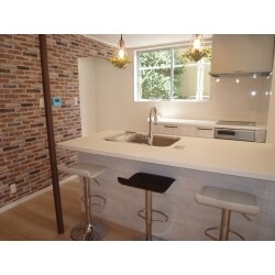 収納場所や作業スペースを広く取るため、I型キッチンから二列型対面キッチンにご提案。新たに設置する窓は、隣の視線を気にしないよう高めにし、より光の入る明るいキッチンになるように設置