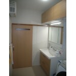 収納量の多い洗面化粧台を採用。ストック品は吊戸に収納、毎日使う化粧品等は三面鏡の裏へ収納と用途に合わせて収納できるようにした。洗濯機上の吊戸は使いやすくアップダウンする吊戸にした。 出入り口は引きに変更し出入りしやすく、床はクッションフロアで仕上げ掃除がしやすくしました。
