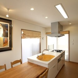 台所と洋室が別々で暗く使い勝手が悪いと感じていたので、光が射し込む明るい開放的な空間にしたいと思い相談しました。ご提案いただいたときには、正直斬新なレイアウトに戸惑いましたが、「私の要望(キッチンと収納の関係)を叶えるには、このプランしかない!!」と思い切ってよかったです。キッチンまわりの使い勝手が絶妙で、毎日とても楽しくお料理できています。見た目も雰囲気も素敵で、さすがプロだと思いました。収納が思った以上に使いやすく、料理を作るときにとても楽になりました。素材にもこだわってくれ、子どもたちにも配慮してあり、大変満足しています。
