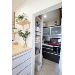 ダイニングとの間仕切りとして、壁いっぱいの収納があり、量は申し分ないものの、キッチンが暗い印象でした。 以前のパントリーは、奥行きが深く、キッチン周辺の収納としては、使いにくいサイズでした。