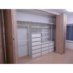 洋室には半畳の収納があり、タンスが並んでいました。既設収納まで含めた壁面収納プランをご提案。2間間口の折戸は各扉を自由にスライドさせることも、箇所ごとに固定することもでき、用途に合わせて切換えできます。内部は支柱に棚や引き出しパイプなどを組み合わせるユニット収納を利用。ご希望に合わせていくつかプランを作り、変更しながらお客様の理想に近付けていきました。床と壁紙も貼替え、機能的なお部屋になりました。