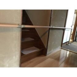 トイレ扉は元々狭く、アコーディオン扉にするとタタミシロを考慮すると出入りが困難になる恐れがあり、開口部を広げても開き戸はお父様が開きにくいので折れ戸を提案しました。 手摺が必要な部分に階段入口及び開口部がある為、一般の壁付の他、開閉式や支柱タイプも併用した。