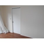 洋室1の入り口となる引戸。壁と同色にし空間を区切らないようにしています。