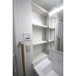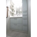 ユニットバス1416サイズで広くした為、洗面所は狭くなりました。その為、洗面台を引き出しへ変更し、洗面台の左手隙間には可動棚、右手にはトールサイズの収納を設置。洗濯機置き場の横にもトールサイズの収納を設置したので、狭くなったにも関わらず、収納力は向上しました。