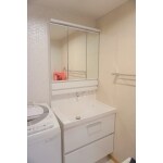 洗面台は、白で清潔感も抜群。 吸放湿性能のエコカラットをおすすめいたしました。三面鏡も使い勝手が良いです。