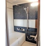 石目調のシックな空間から清潔感溢れるブルーとホワイトの浴室に