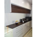 今まで背面収納の吊戸下部分をカフェカーテンで隠していたので、生活感がでていた。 手元を隠せるような、造作カウンター。