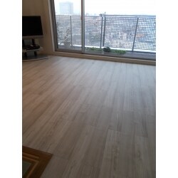 T様が元々の淡いベージュのフローリングの雰囲気をお気に召していたため、近いお色味で床材を選定させていただきました。 また木目の”節”があまり目立たないものを、とのリクエスト。 マンション規定の遮音等級をクリアし、且つ床暖房対応のLIXILラシッサDフロアをご提案いたしました。 幅木は壁に色を合わせて、しっくいホワイト柄をチョイスしました。