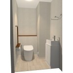 トイレをコンパクトにしてタンクレスにし、収納付きの手洗い水栓を設置すれば、トイレに必要な機能をカバー出来ることをご提案。