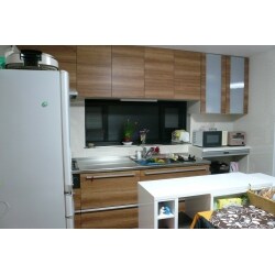 家具の配列を変えて、システムキッチン横に家電収納付カップボードを並べ、スッキリとした収納をご提案し、流し台周りの壁は、キッチンパネルの使用をおすすめしました。 収納がしやすいというご要望に対しては、キッチン背部に収納カウンターを設置することで、動線を考慮した使い勝手の良い収納をご提案しました。
